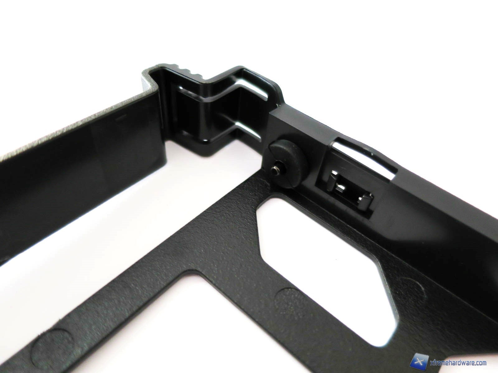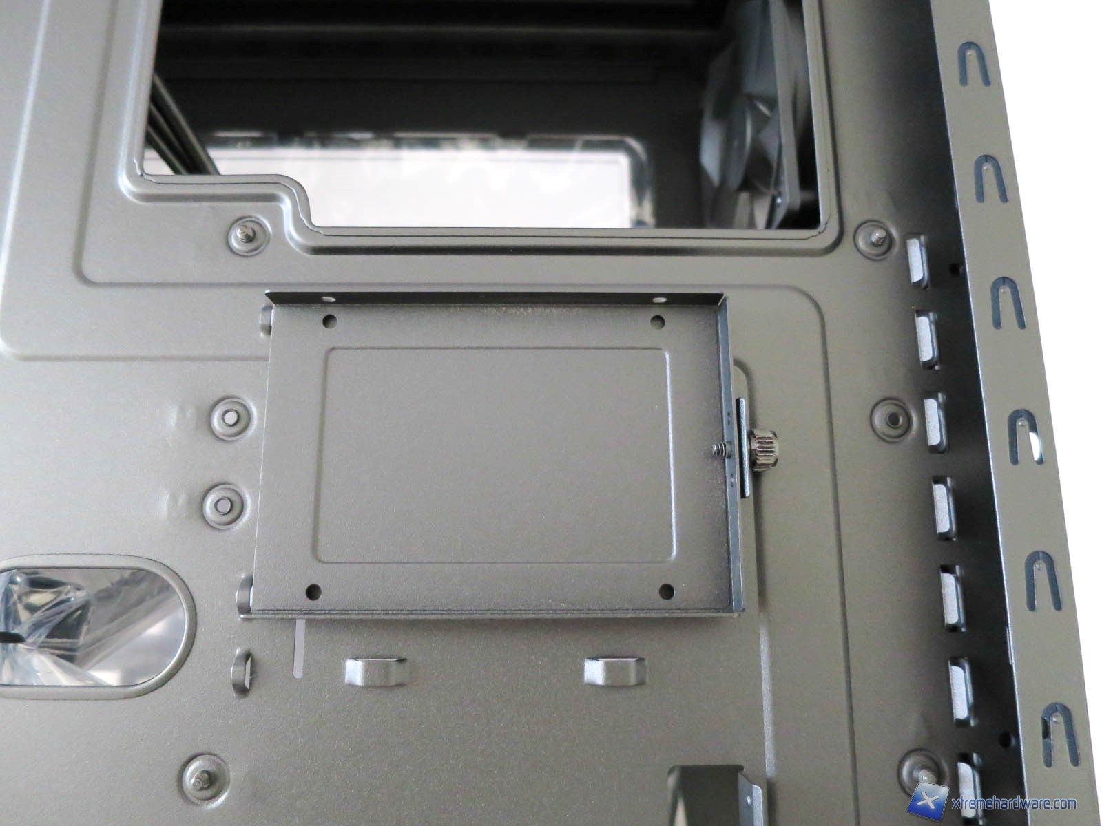 Nel retro troviamo inoltre due comodi supporti in metallo per SSD che permetteranno dunque un posizionamento oculato di tali drive per agevolare anche il cable management. I supporti sono ancorati nel retro del case tramite delle viti Tool-less che ne semplificano l’installazione e rimozione. Notiamo però come i due supporti, seppur di forma identica, abbiamo una collocazione differente, infatti uno è presente nel tray della scheda madre mentre l’altro in corrispondenza della struttura per i cage degli Hard Disk da 3,5 pollici. Inoltre è da notare anche la possibilità di spostare in due collocazioni diverse sia il supporto di destra che quello di sinistra in posizione superiore o inferiore. Altra nota importante è quella che i due supporti in metallo sono intercambiabili quindi potremo sfruttare i supporti nella stessa posizione. Ci basterà ad esempio prendere il supporto di sinistra, rimuovere i supporti in plastica e far entrare i due pioletti in metallo nelle sedi presenti nella parte di destra così da avere due SSD nella stessa posizione. Procedimento analogo è effettuabile anche con il supporto di destra a cui andranno aggiunti i supporti in plastica forniti in bundle.