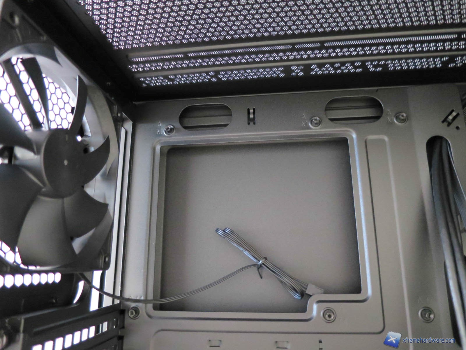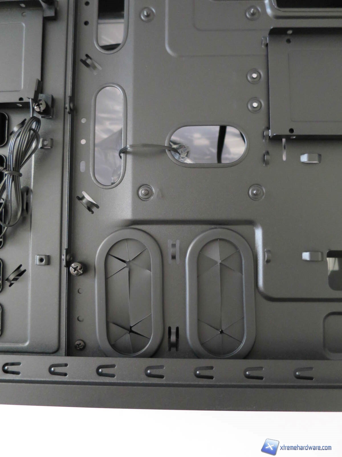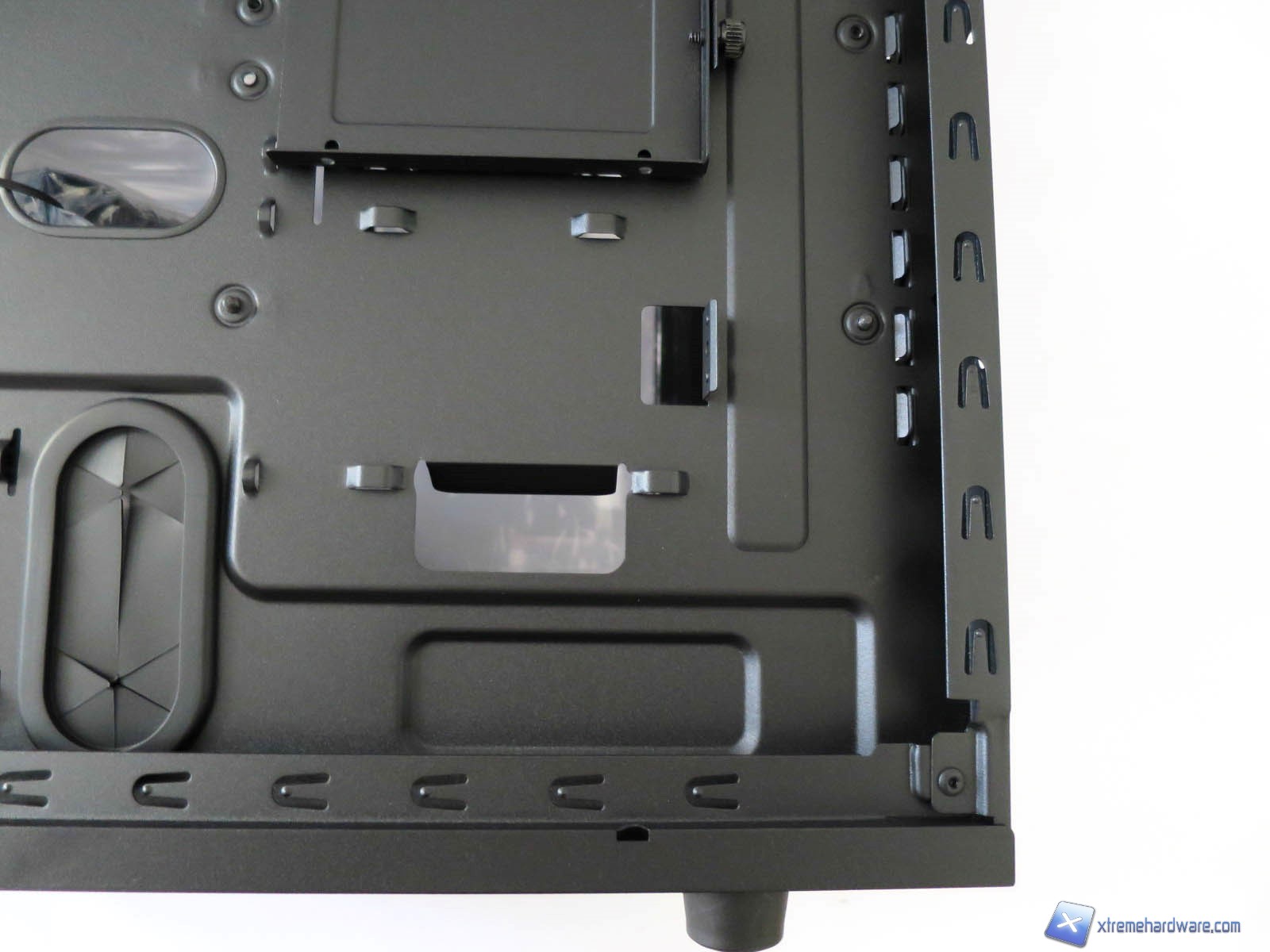 Passiamo ora dunque ad analizzare l’interno del Thermaltake Core V31. Abbiamo già detto che il Core V31 è un case in formato Mid-Tower con predisposizione per schede madri fino al formato ATX. Ci aspettiamo dunque un buon layout ed adeguato spazio per l’installazione di ogni componente nel miglior dei modi. Il piatto scheda madre è in SECC ed ha un’ottima resistenza. Sono presenti molti fori che permettono un cable management ottimale. Unica nota negativa, se così vogliamo chiamarla, è l’assenza di un rivestimento gommato per tutti i fori come spesso avviene in altri case di questa fascia di prezzo. Questo aspetto non limita il cable management o altro, ma solo l’estetica finale del PC. Anche l’area adibita al montaggio del dissipatore ha un’ottima superficie in modo tale da eseguire l’installazione del dissipatore anche dopo aver montato il resto della configurazione. Tale soluzione spesso semplifica di molto anche il cable management dei cavi dell’alimentatore stesso. Nel dettaglio comunque troviamo 10 fori di cui 8 con la classica forma ovale e due di questi otto rivestiti di gomma anche se tutti i fori principali hanno gli angoli smussati evitando dunque tagli. Guardando il case dalla parte frontale notiamo che in prossimità del cage modulare degli Hard disk sono presenti altri fori utilizzabili per il cable management. Inoltre le paratie hanno una bombatura centrale che permette di raccogliere i cavi. Lo spazio a disposizione è comunque adeguato grazie ai circa 2 millimetri di spazio tra il tray della scheda madre e quello delle guide per chiudere la paratia.